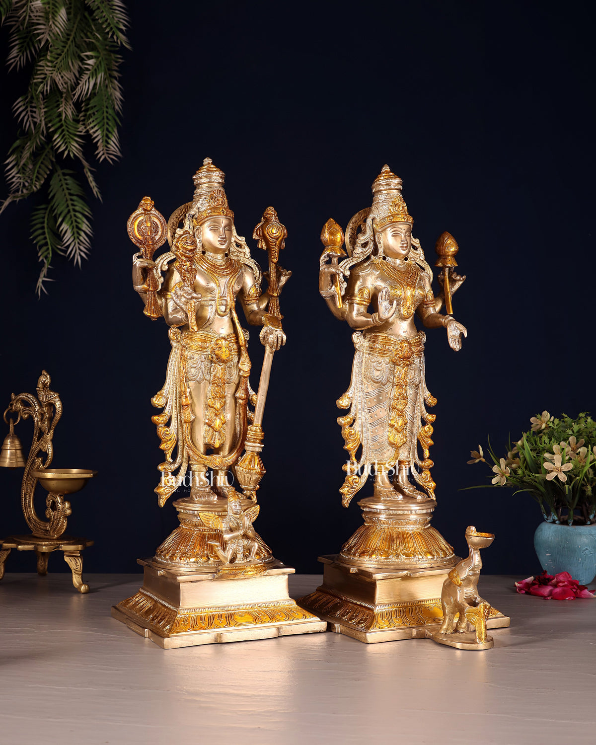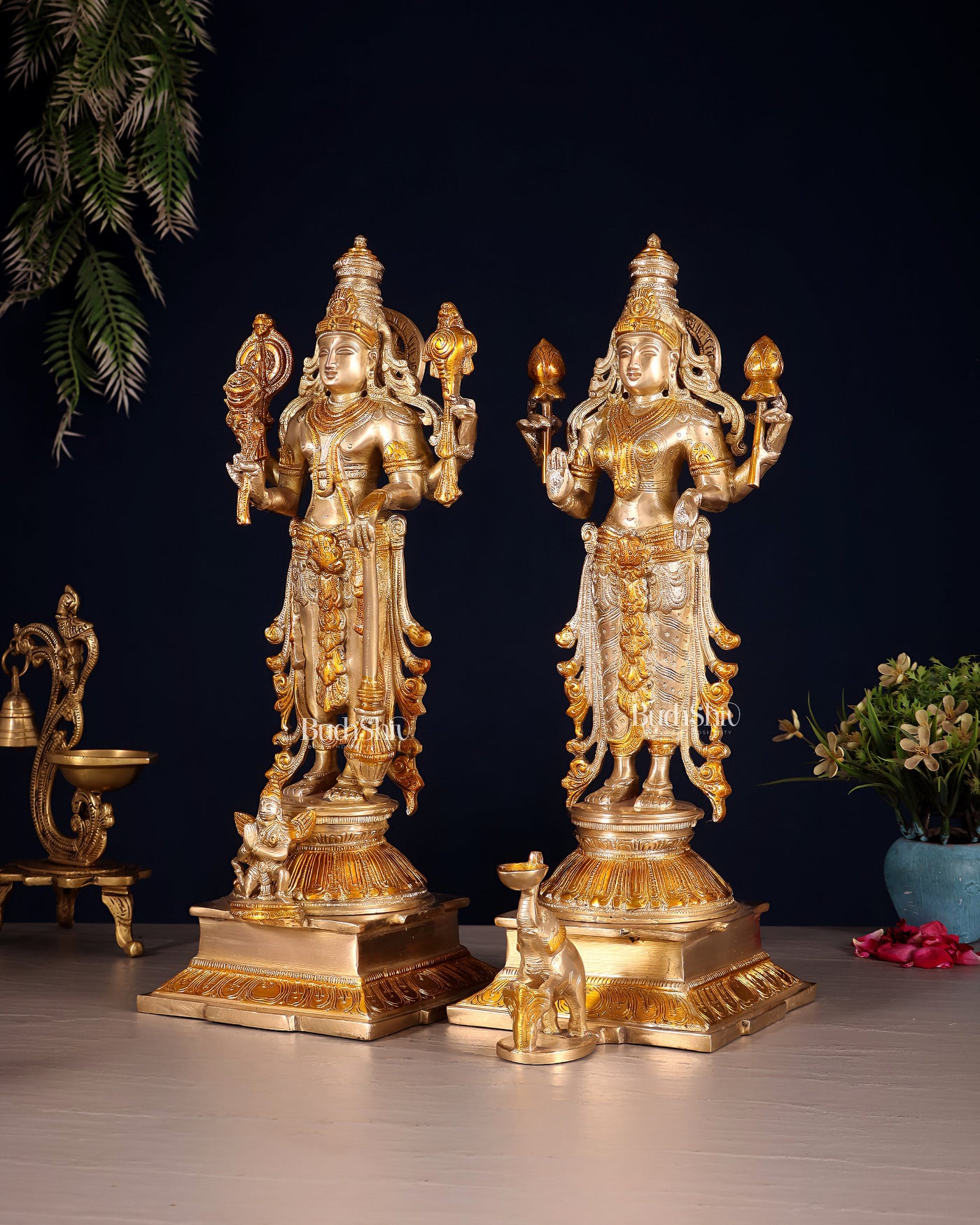 Bring home divine grandeur with this exquisite Pure Brass Standing Vishnu Idol Set, featuring Lord Vishnu, Goddess Lakshmi with Elephant, and Garuda, crafted in Chola-style artistry. Finished in a striking dual-tone bright gold and yellow highlight, this set embodies opulence and devotion.