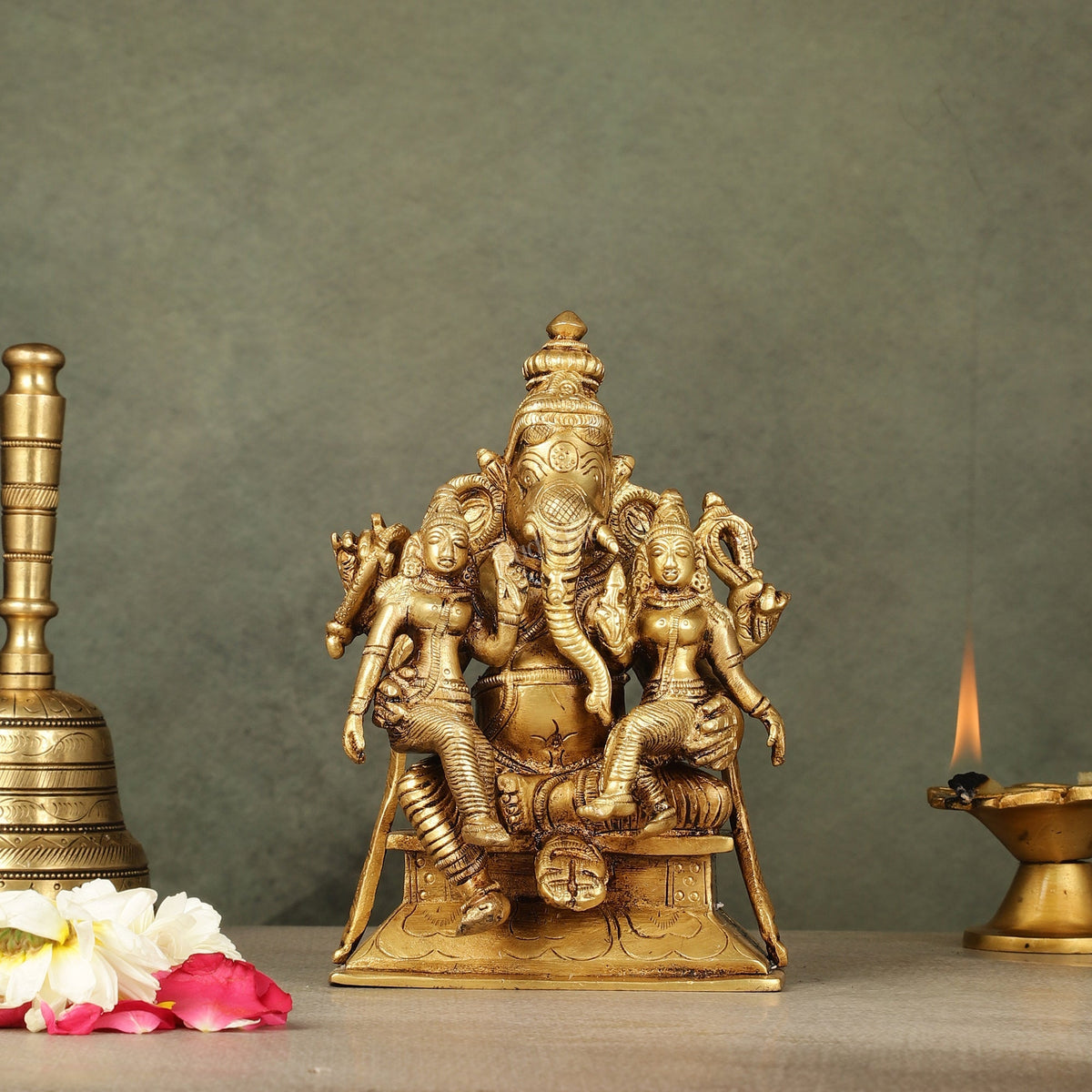 Divine Pure Brass Lord Ganesha Statue with Riddhi and Siddhi | 7"