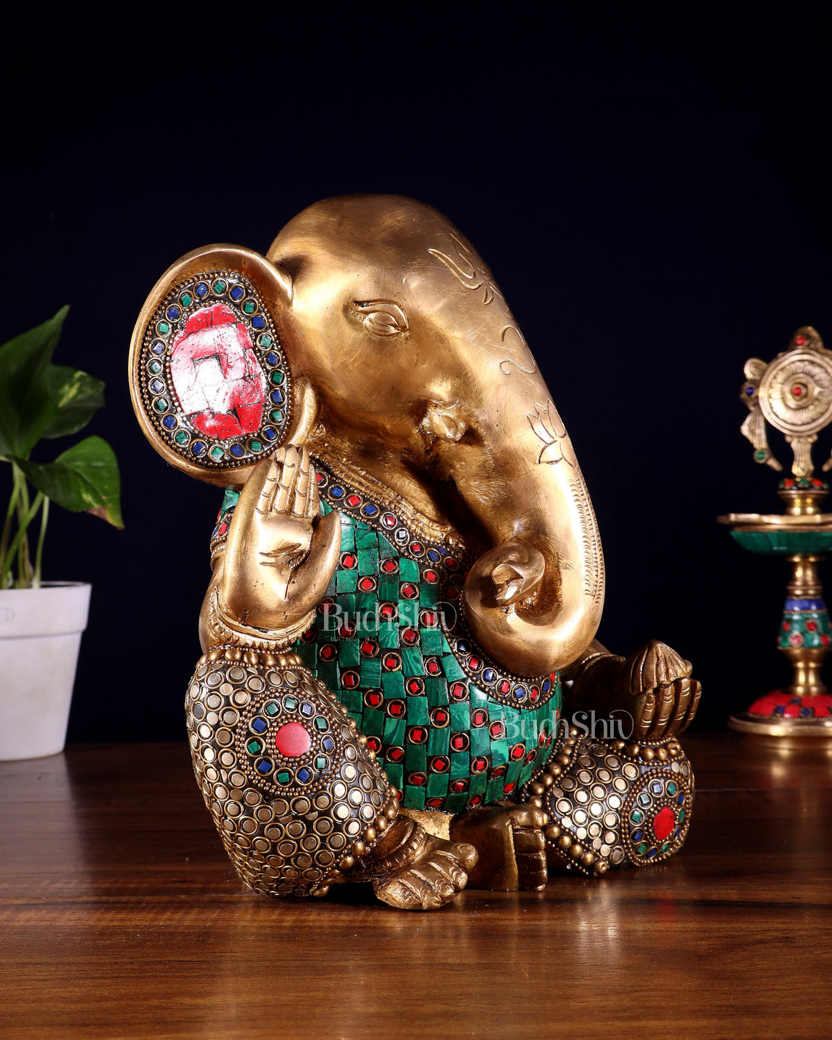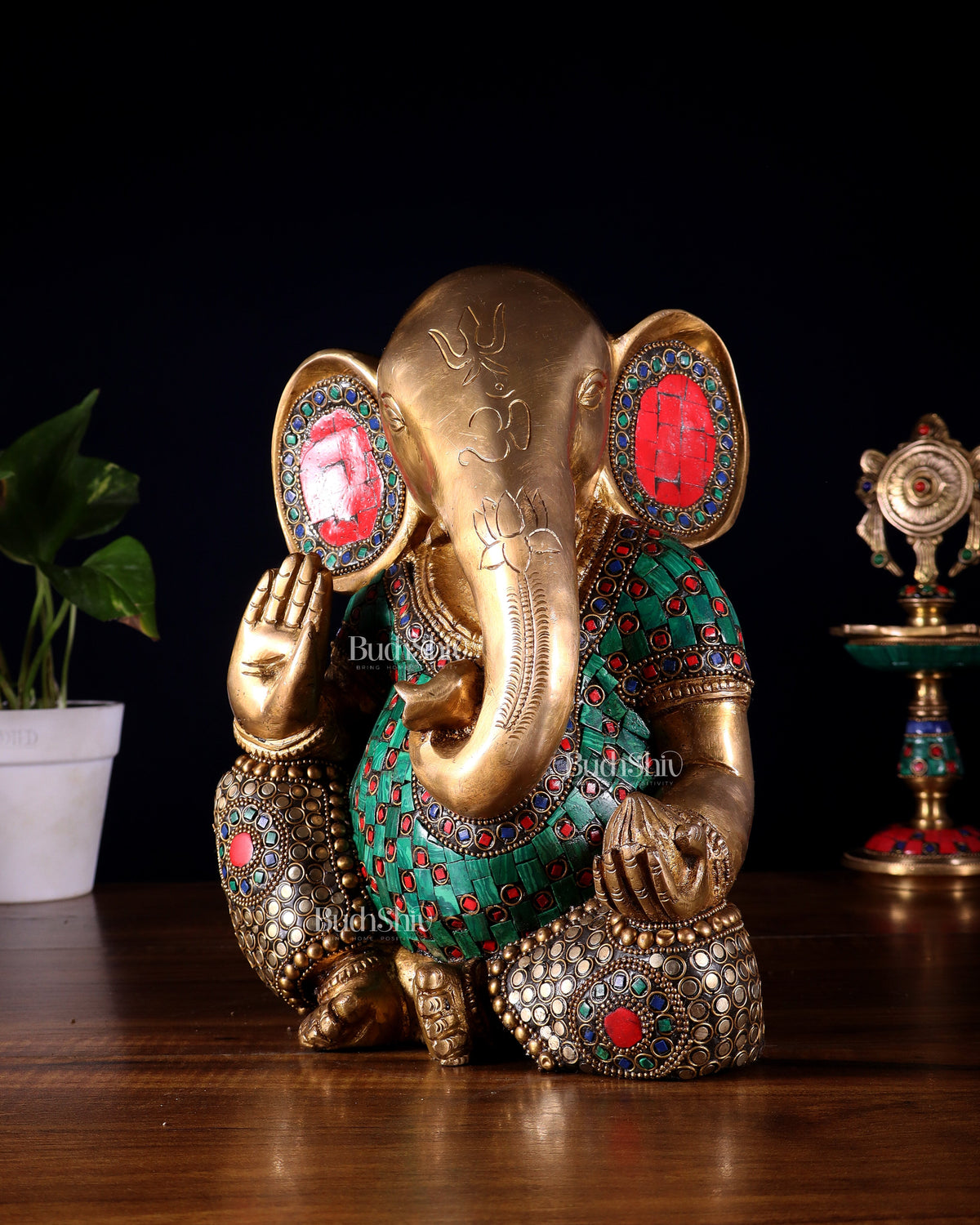 Pure Brass Modern Ganesha Idol with Abstract Design and Stonework 9.5"