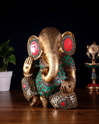This unique Pure Brass Ganesha idol features a modern abstract design adorned with detailed stonework, bringing a contemporary touch to traditional spirituality. Ideal for adding an artistic element to your home or office space.