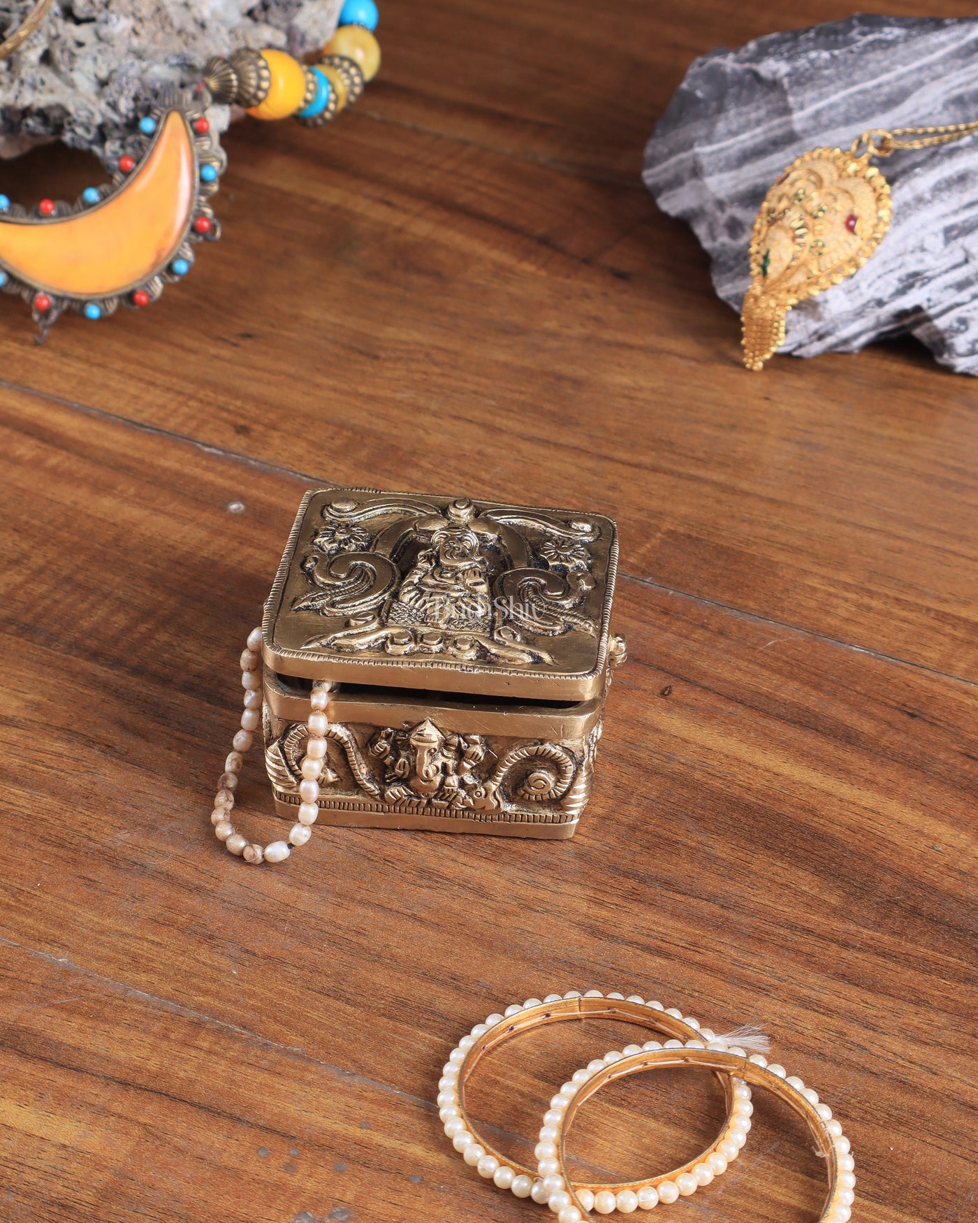 Bring home the divine presence of Lord Ganesha with this exquisitely handcrafted brass storage box. Designed with intricate carvings, this multipurpose box is perfect for storing jewelry, sacred items, or small valuables while adding a touch of spirituality to your space.