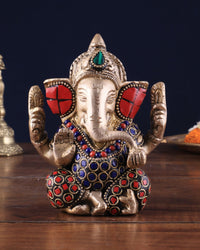 Small Pure Brass Lord Ganesha Idol with Stonework - 5 Inch