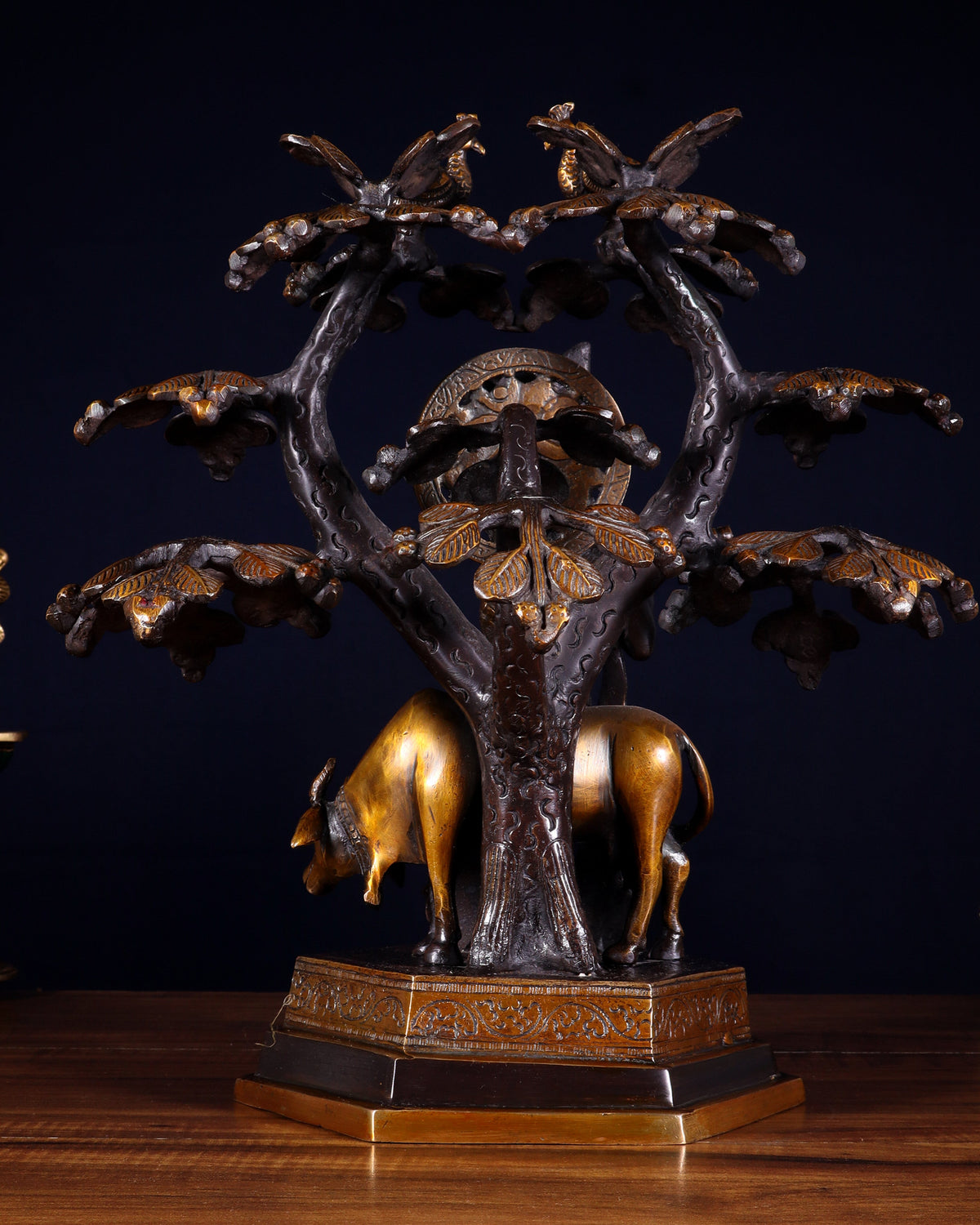 Superfine Brass Lord Krishna with Cow under Tree Statue – Black Golden Antique Tone