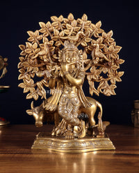 Pure Brass Lord Krishna with Cow & Kalpavriksha Tree Statue 12 inch