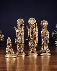 Brass Ram Darbar idol set depicting Lord Ram, Sita, Lakshman, and Hanuman. A devotional centerpiece for home, pooja rooms, and cultural décor.