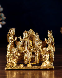 Brass Ram Darbar idol set depicting Lord Ram, Sita, Lakshman, and Hanuman. A devotional centerpiece for home, pooja rooms, and cultural décor.
