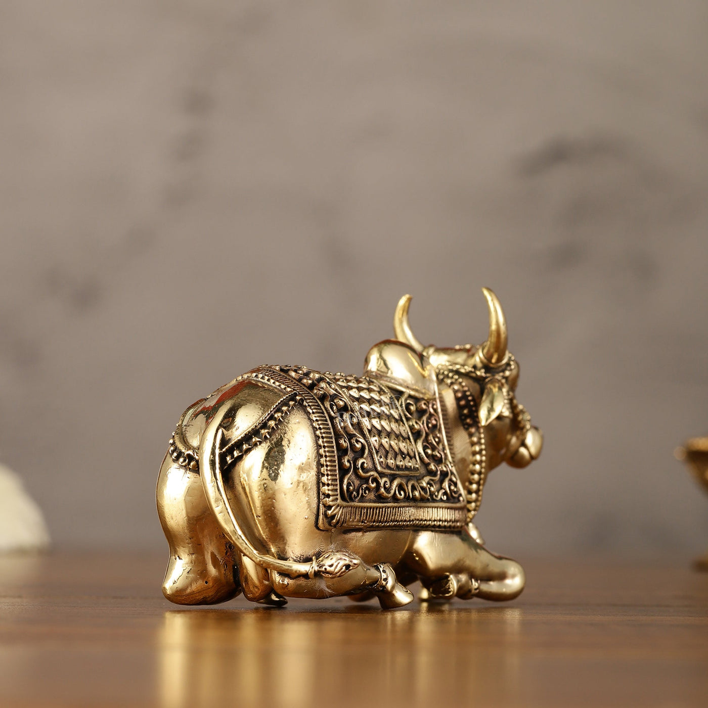 Discover divine serenity in a petite form with our Brass Superfine Miniature Nandi Idol. Standing at 2.5 inches, with dimensions of 4 x 1.5 inches, this intricately crafted miniature masterpiece weighs a mere 0.190 kg. Invite the sacred presence of Nandi, the devoted mount of Lord Shiva, into your home.