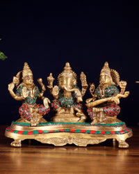 Brass Ganesha, Lakshmi, and Saraswati idol set on same platform. Ideal for home temples, study tables, office temples, and as decorative pieces in living rooms or entrances Dimensions in inches: 6.2" H x 9.4" W x 5" D,