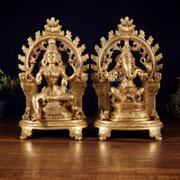 This exquisite brass idol set features Lord Ganesha and Goddess Lakshmi, each intricately handcrafted and adorned with a Prabhavali (ornamental arch) — a symbol of divine radiance and protection. Together, they represent a powerful blend of wisdom, prosperity, and auspiciousness.
