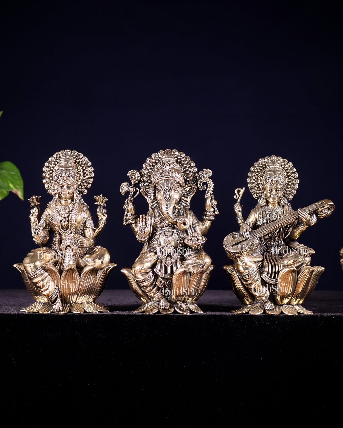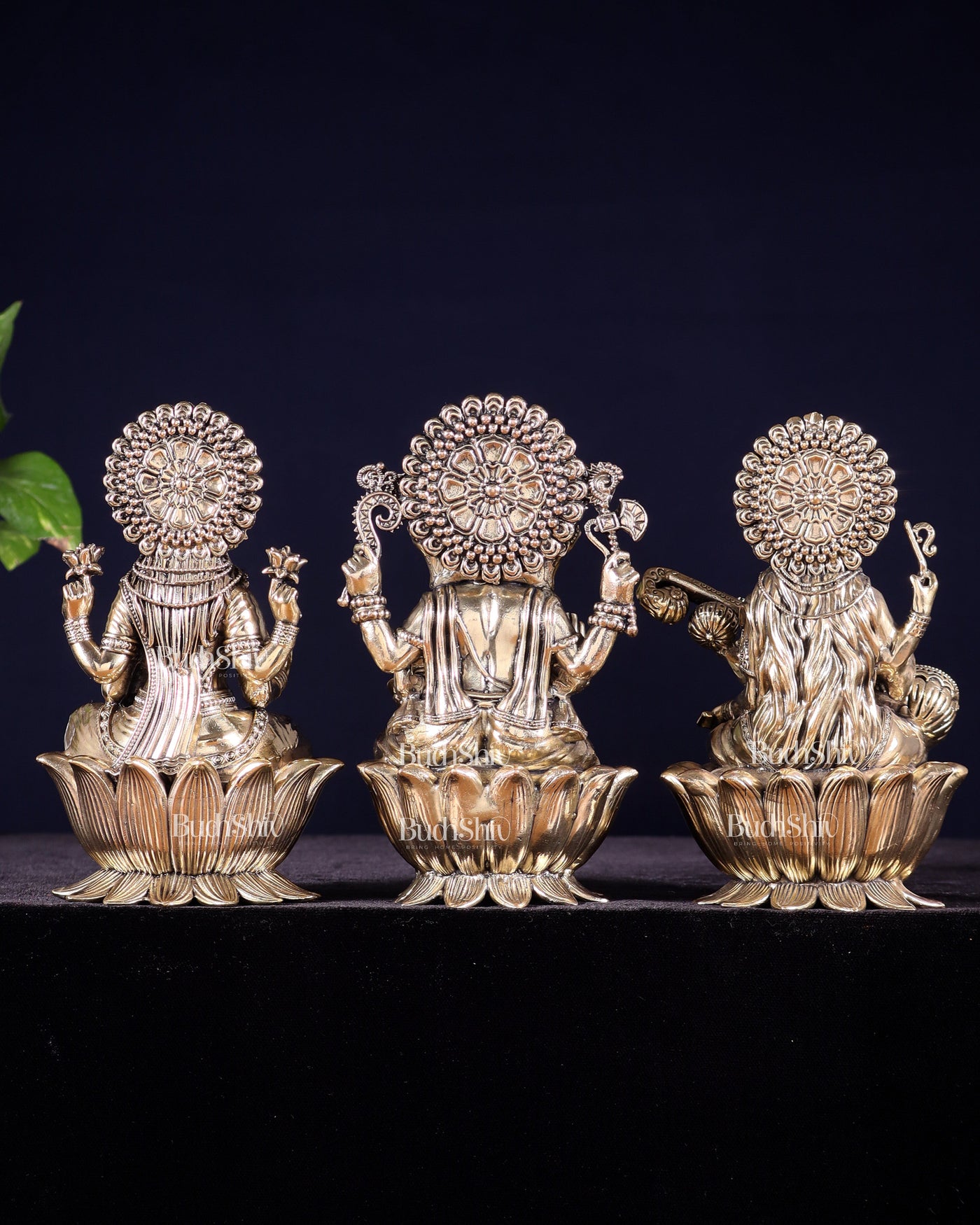 Pure Brass Superfine Ganesha Lakshmi Saraswati Idol Set – Available in 4, 6 & 8 Inches - 4 inch idols: Height: 4" Width: 2.5" Depth: 2.5" each, Combined Weight: 629 g